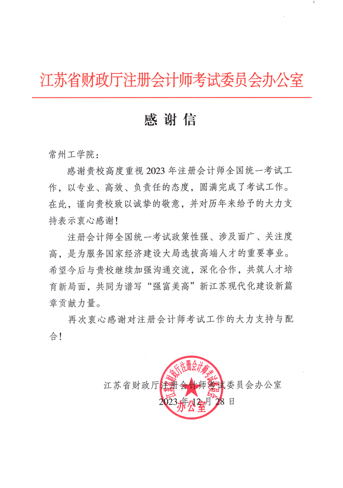 近日,江苏省财政厅发来感谢信,对我校圆满完成2023年注册会计师全国统一考试组织实施工作予以感谢。